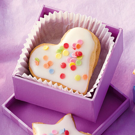 Aus Puderzucker, 2 EL Wasser und Zitronensaft eine Glasur anrühren, die Plätzchen damit bestreichen, mit Streuseln verzieren und trocknen lassen.