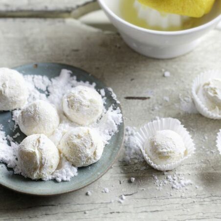 Fein säuerlich und schön fruchtig. Für die zart-weißen Trüffel braucht man nur wenige Zutaten: Zitronen, Kuvertüre, Puderzucker und Butter. Fertig.