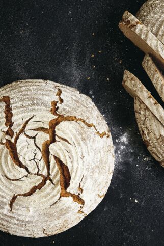 Der gegangene Laib sollte sein Volumen deutlich vergrößert haben. Backen Sie ihn zehn Minuten bei 220° an und schalten Sie die Temperatur dann auf 210° herunter, um das Brot in weiteren dreißig Minuten fertig zu backen.
