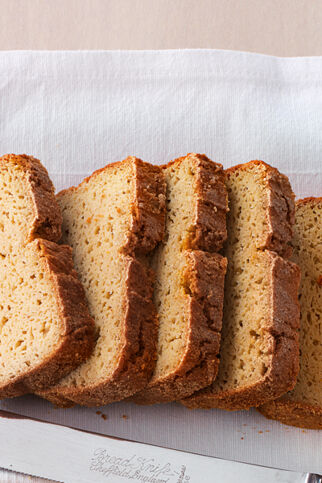 Brot in große Stücke, diese waagrecht in Scheiben schneiden. Scheiben mit nassen Stellen wegwerfen. Feuchte, dichte und klebrige Stellen treten vor allem in Roggenbroten auf, wenn der Teig nicht genügend geknetet wurde oder nicht lange genug gehen durfte.