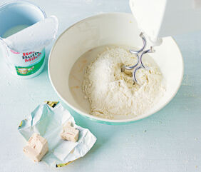 Den Teig auf bemehlter Arbeitsfläche 2 Min. gründlich kneten. In eine bemehlte Schüssel geben, mit Frischhaltefolie abdecken und 1 Std. gehen lassen.