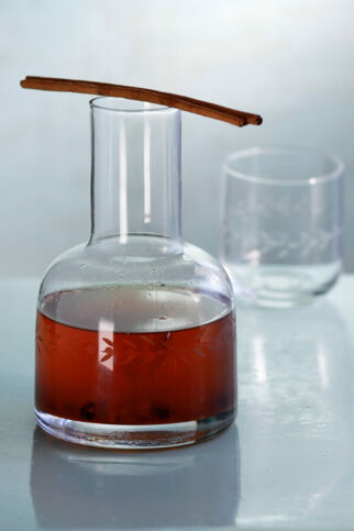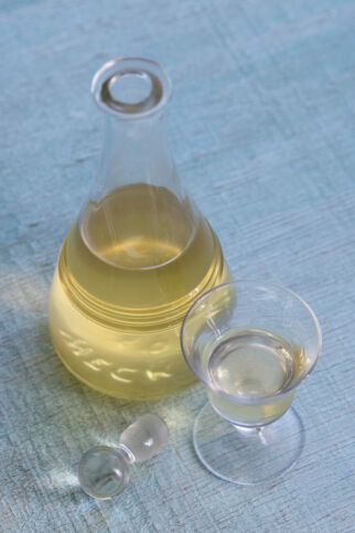 Fülle den Likör in eine hübsche Glasflasche und dekoriere ihn mit hübschen Kräutern und Etiketten.