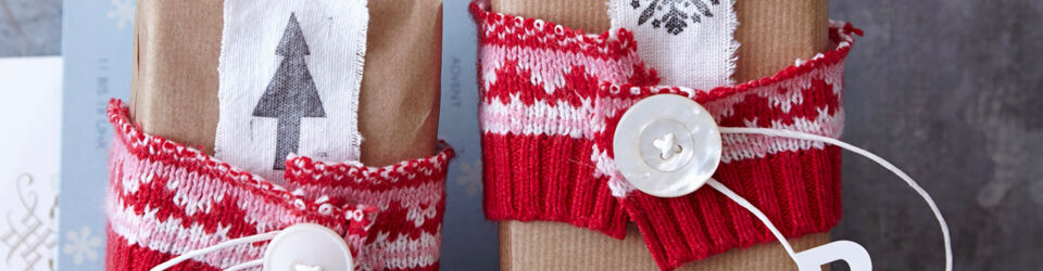 Schneide mit der Stoffschere von einem alten Strickteil 2 Streifen ab, die du um je 1 Paket windest. Ziehe das Papierband zuerst durch beide Enden des Strickstreifens, dann durch die Löcher eines Knopfs. Verknote das Band auf der Knopfrückseite und klebe den Anfangsbuchstaben eines Namens an das Papierband oder direkt aufs Paket.