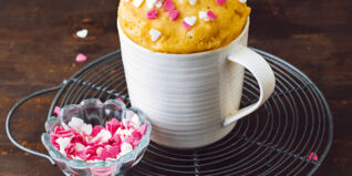 Den Becher in die Mikrowelle stellen und den Kuchen bei 600 Watt ca. 1 Min. 20 Sek. backen, bis die Oberfläche fest ist. Mit Zuckerherzen bestreuen.