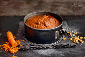 70 g Walnusskerne grob hacken. 2 Eier (M), 125 g braunen Zucker und 160 ml Sonnenblumenöl in einer Rührschüssel mit den Quirlen des Handrührgeräts schaumig schlagen. 180 g Mehl, 2 TL Backpulver, 1 TL Zimtpulver, 1⁄2 TL frisch geriebene Muskatnuss, 1⁄2 TL Ingwerpulver sowie Walnüsse und Möhren dazugeben und alles untermengen. Teig in die Form füllen, glatt streichen und im Ofen (Mitte) 50–60 Min. backen.