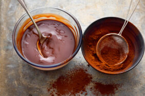 160 g Mehl, 60 g Kakaopulver, 2 TL Backpulver und 1 Prise Salz dazugeben und untermengen. Den Teig in die Form füllen, glatt streichen und im Ofen (Mitte) 45 – 55 Min. backen. Info: Wird der Teig in einer anderen Springformgröße gebacken, variiert die Backzeit. Mit einem Holzstäbchen testen.