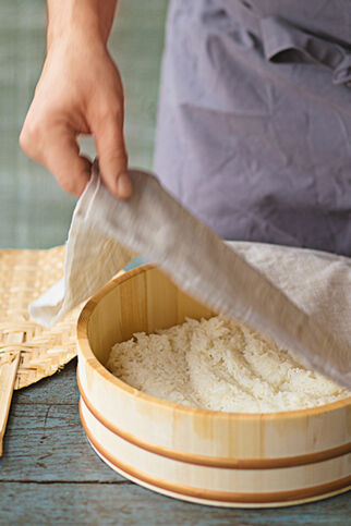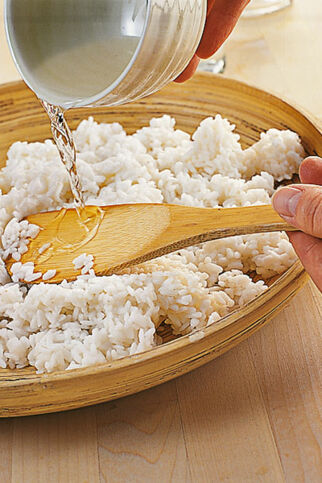 Tipp: Hierfür kannst du den Reis ganz einfach in ein Sieb füllen, welches du wiederum in eine Schale mit Wasser setzt. Bewege dann die Finger kräftig durch die Reiskörner, damit durch die Reibung Stärke aus den Körnern gewaschen wird. Dies kannst du daran erkennen, dass sich das Wasser milchig-trüb färbt. Ersatzweise kannst du das Sieb mit den Reiskörnern auch direkt unter fließendem Wasser reinigen.