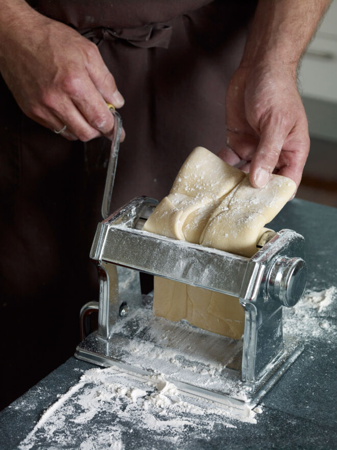 Das Prinzip für selbstgemachte Nudeln ist ganz einfach: Der Teig wird nach Rezept zubereitet, darf kurz ruhen und wird anschließend portioniert. Anschließend werden die Teigportionen entweder mit dem Nudelholz oder einer Nudelmaschine zu dünnen Platten geformt. Wer hier eine Nudelmaschine benutzt, arbeitet sich von der weit gestellten Walze zur eng gestellten vor.