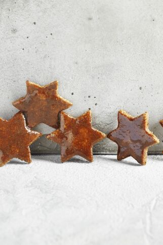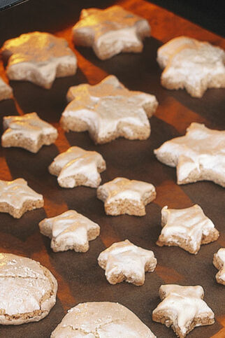 Zimtsterne nacheinander im vorgeheizten Backofen (Mitte) je ca. 20 Min. backen. Dabei ein leeres Blech eine Schiene darüber einschieben, damit die Plätzchen hell bleiben.