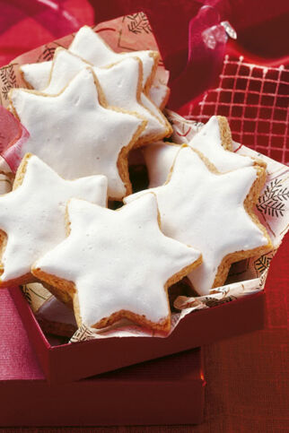 Für die Glasur das Eiweiß mit 1 Prise Salz und Puderzucker zu steifem Schnee schlagen und die Sterne damit bestreichen.