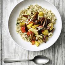 Rotwild-Geschnetzeltes auf Blumenkohlreis mit süßsaurer Sauce