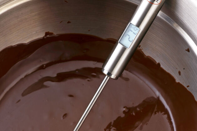 Die Kuvertüre muss dabei auf 27–28 °C abkühlen. Anschließend kannst du die Kuvertüre auf die gewünschte Verarbeitungstemperatur erhitzen: