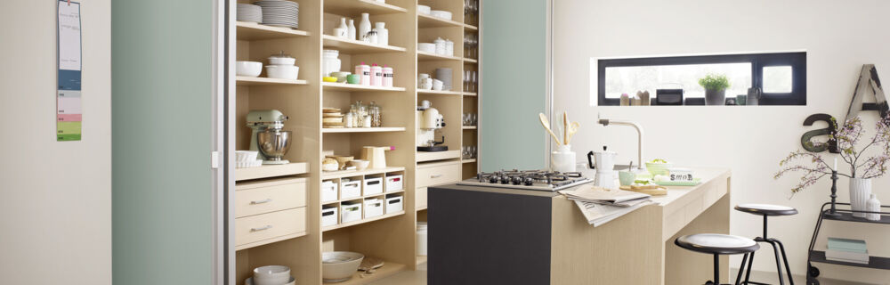 Mit Einbauschränken plant ihr gleich einen seitlichen Abschluss der Schränke ein. Statt der leeren Fläche sind das vielleicht kleine Regale, in denen ihr eure Gläser oder Vorräte aufbewahrt. Das sieht gut aus und ihr nutzt jeden Zentimeter aus.