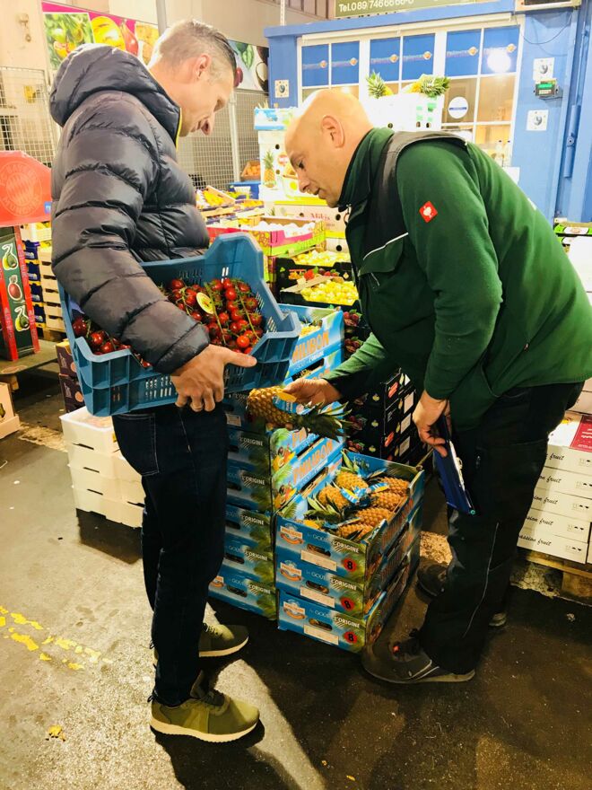 Der Ausflug auf den Großmarkt war übrigens auch für den Sternekoch nichts Alltägliches. Denn den übernimmt normalerweise der Gemüsehändler seines Vertrauens, Ingo Bähner-Gutekunst, für ihn. Die beiden telefonieren täglich miteinander. Ingo berichtet, welche Obst- und Gemüsesorten tagesaktuell besonders zu empfehlen sind (oder eben nicht mehr). Die Karte des Restaurants wird dementsprechend angepasst. Ein aktuelles Problem, das sich bei unserem Besuch bereits abzeichnete: Der Spargel und die ersten deutschen Erdbeeren sollen am Muttertagswochenende knapp werden – für Anfang Mai ist es viel zu kalt. Seine tägliche Bestellung gibt der Küchenchef übrigens bis 23:00 Uhr ab, die Ware wird am nächsten Tag bis 07:00 Uhr geliefert. Während wir noch schlafen, tobt im Großmarkt das Leben.