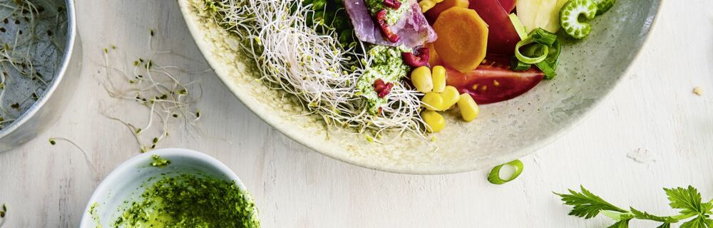 Saucen und Dressings steuern Extrawürze bei. Wenn kalt gepresste Pflanzenöle, Nussmuse oder Avocado mitspielen dürfen, dann spenden sie auch eine gesunde Portion wertvoller Fette. Das i-Tüpfelchen bilden Toppings wie Nüsse und Samen, aber auch Würziges wie Kapern, Kräuter oder Käse. Prima als Nährstoff-Booster: Sprossen.