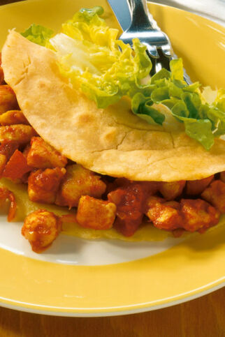 Für die Tortillas Mehl mit Salz und Öl in einer Schüssel vermischen und mit Wasser zu einem glatten Teig verrühren. Das Ganze für 20 Minuten quellen lassen. In einer beschichteten Pfanne bei mittlerer Hitze etwa 3-4 EL Teig mit dem Löffel glatt streichen und von beiden Seiten knusprig braun braten.