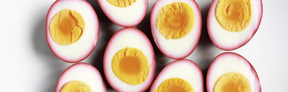 - marinierte Eier oder Eier mit Sauce (z. B. Senfeier, Soleier, chinesische Tee-Eier oder Rote-Bete-Eier)