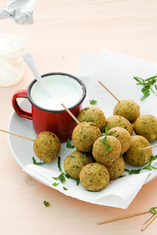Traditionell isst man Falafeln mit Tahina, das ist eine Sesamsauce mit einem leicht herben Geschmack. Sehr beliebt ist auch cremiger Hummus oder Joghurtsauce. In unserer Rezeptgalerie findest du verschiedene Dips und Saucen, die lecker schmecken und schnell zubereitet sind: Versuche doch mal Paprika-Hummus, einen Joghurt-Tomaten-Dip, Möhren-Tsatsiki oder einen fruchtigen Mangodip!