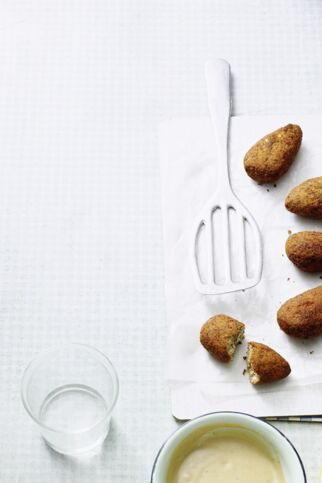Nun kannst du die Masse kräftig mit Gewürzen abschmecken. Außerdem kommen (je nach Rezept) Mehl und Backpulver hinzu, damit du aus dem Kichererbsenteig Bällchen formen kannst. Sie sollten etwa walnussgroß und etwas abgeflacht sein. Die kleinen Bällchen kannst du in einer großen Pfanne im heißen Öl anbraten oder in heißem Pflanzenfett in einem Topf portionsweise frittieren, bis sie schön gebräunt sind. Dabei einmal wenden.