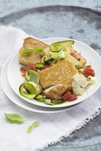 Eine weitere Möglichkeit für die ultimative Knusprigkeit ist das Panieren des Tofus. Dazu solltest du zuallererst den Tofu in 1 cm dicke Scheiben schneiden. Dann mischst du Semmelbrösel und Sesam in einem tiefen Teller. In einem zweiten Teller verquirlst du Eier mit Sojasauce und würzt dies mit Salz und Pfeffer. In einen dritten Teller füllst du Mehl. Jetzt müssen die Tofu-Scheiben die "Panierstraße" durchlaufen: Wende sie zuerst in dem Mehl, dann in der Eiermischung und zuletzt in der Brösel-Sesam-Mischung. Du solltest die Panade gut an den Tofu drücken, damit sie nicht abbröselt.