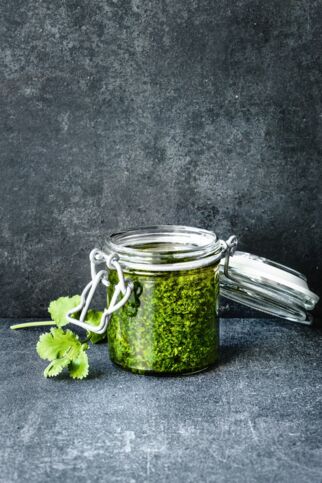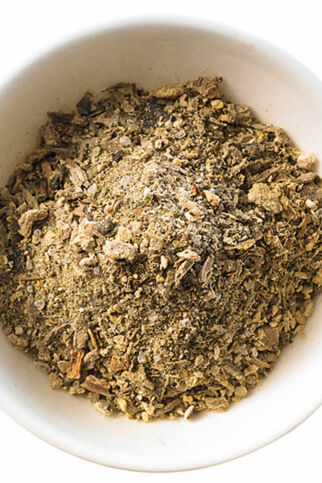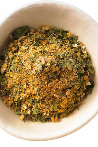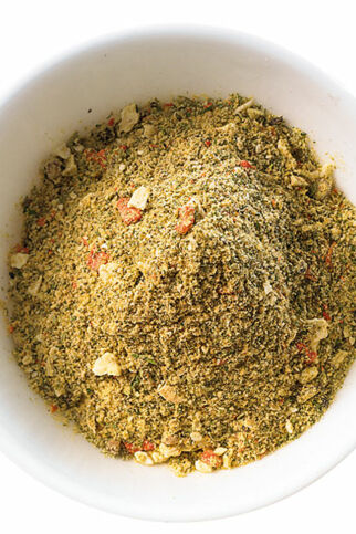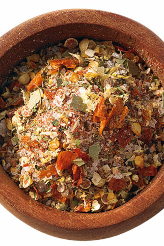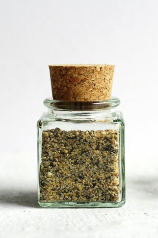 Ein einfach anmutender Klassiker, der aber dein Essen auf die nächste Ebene heben kann: Kräutersalz verfeinert Gemüse, Kartoffeln und Dips. Dafür vermischst du grobes Steinsalz mit Knoblauchflakes, weißem Pfeffer, getrockneter Zitronenschale, getrockneten Rosmarinnadeln, getrocknetem Thymian und getrocknetem Salbei. Du kannst auch 2 Lorbeerblätter in Stückchen brechen und untermischen.