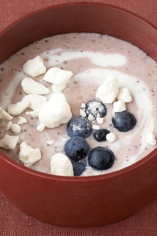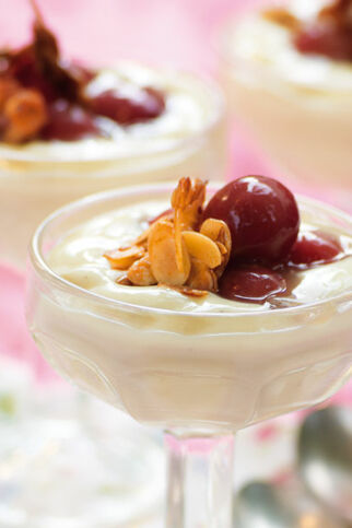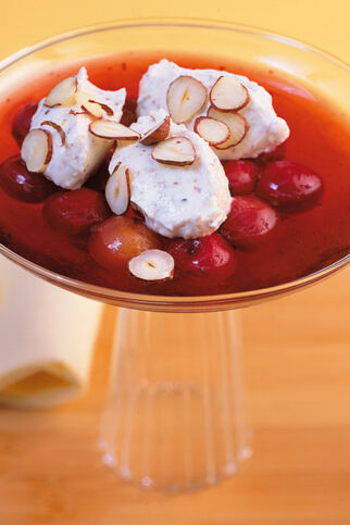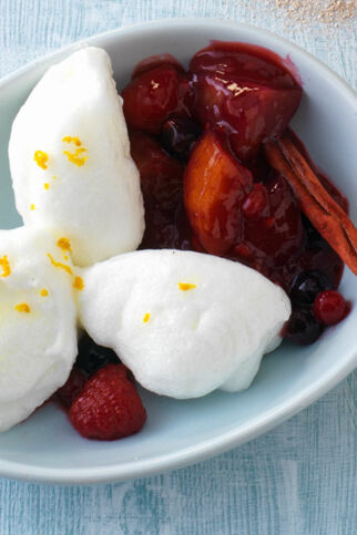 Eine Beeren- oder Kirsch-Kaltschale lässt sich sehr hübsch mit Sahne-Nocken dekorieren. Dazu einfach Sahne steif schlagen, mit Quark und Zucker verrühren. Die Masse mit zwei Esslöffeln zu Nocken formen und auf die erfrischende Kaltschale setzen.