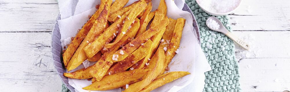 Wer kennt nicht das Problem labberiger Pommes, vor allem, wenn man sie aus Süßkartoffeln herstellen will. Daher hier ein paar Tipps: Am besten wäscht man die Pommesstifte vor dem Garen, bis die Stärke herausgewaschen ist. Dann gut trocken tupfen. Wenn du deine Pommes in der Fritteuse bzw. in einem großen Topf mit Öl frittieren willst, lautet ein Profi-Tipp für krosse Pommes: die Kartoffel-Stäbchen vor dem Frittieren für 10 Minuten in Essig-Wasser kochen. Daraufhin werden sie zweimal frittiert – einmal kurz für nur etwa 50 Sekunden, nach einer Ruhepause noch einmal länger für 3,5 Minuten.