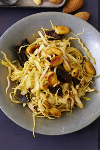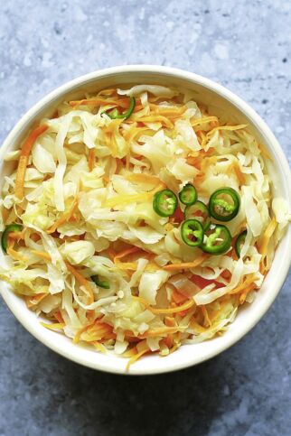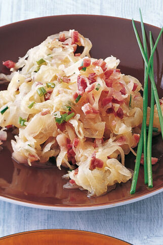Es gibt auch Rezeptvarianten, bei denen die Kohlstreifen in einer Pfanne mit Öl bei milder Hitze 5 Minuten gebraten werden. Dabei das Kraut mit zwei Gabeln ständig wenden, bis es schön glänzt.