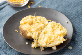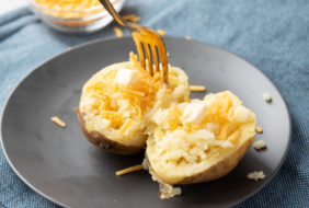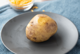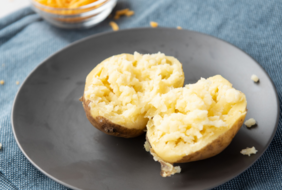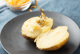 Am besten eignet sich eine faustgroße (ca. 400g schwer), mehlig kochende Kartoffel. Am einfachsten gart man sie entweder bei 200 Grad Umluft für 50-60 Minuten im Ofen oder in der Mikrowelle, bei 800 Watt für 16 Minuten, wobei man die Kartoffel nach der halben Garzeit umdreht.