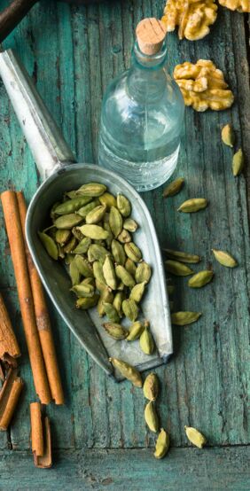 Kardamom gibt es gemahlen oder im Ganzen als grüne Kapseln. Nimm am besten Kapseln, brich sie im Mörser auf, entferne die Schale und zerkleinere die Samen. Rosenwasser, das bei der Destillation von Öl entsteht, gibt's im Backregal.