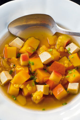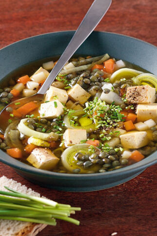 Erbsen-Linsen-Eintopf mit Tofuzwiebeln