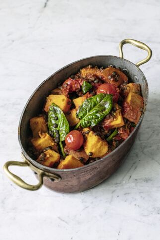 Süßkartoffel-Linsen-Eintopf mit Tomaten und Spinat
