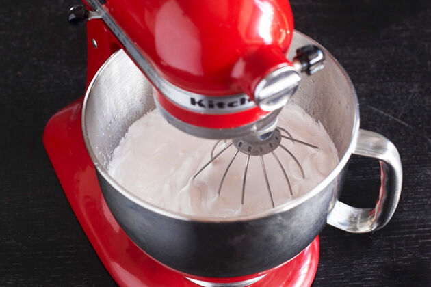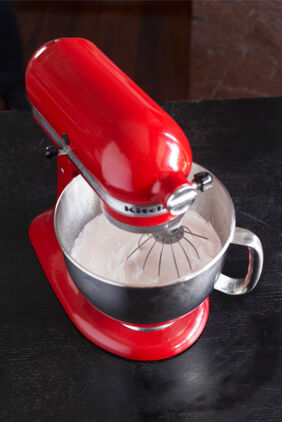 Vermischen Sie die Sirup-Gelatine-Mischung und den Zuckersirup erst auf niedriger, dann auf höchster Stufe Ihres Handrührgerätes oder Ihrer Küchenmaschine. Nur so bekommen Sie eine große, weiche, fluffige Masse. Am Ende sollte sie ungefähr drei Mal so groß sein wie zu Anfang, was bis zu zehn Minuten dauern kann.