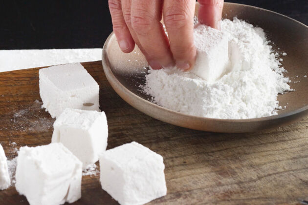 Wälzen Sie die selbst gemachten Marshmallows nach dem Schneiden in Puderzucker, so schützen Sie sie vor dem Austrocknen.