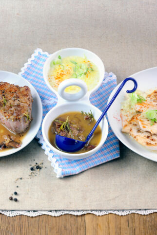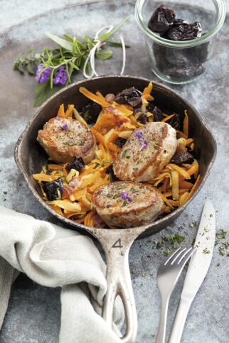 Medaillons sind kleine, runde Fleischstücke, meistens vom Filetstück, die kurzgebraten werden. Am bekanntesten sind Schweinemedaillons, aber die Zubereitung gelingt mit fast allen Fleisch- und manchen Fischarten, z. B. auch Pute, Wild und Seeteufel. Du bekommst Medaillons fertig zugeschnitten beim Metzger oder du kaufst ein Filet mit zartem, kurzfaserigen, fast fettfreien Fleisch. Das schneidest du in dicke Scheiben.