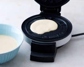 Das Waffeleisen vorheizen. Den Teig nochmals durchrühren. Pro Waffel 1 EL Teig auf die untere Backfläche geben, das Waffeleisen schließen und in ca. 1 Min. goldbraun backen.