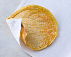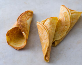 Die Waffel heraus- nehmen, sofort um die Hörnchenform wickeln und so zu einem Hörnchen formen, abkühlen lassen.