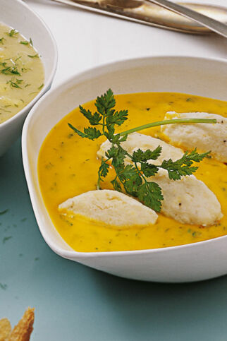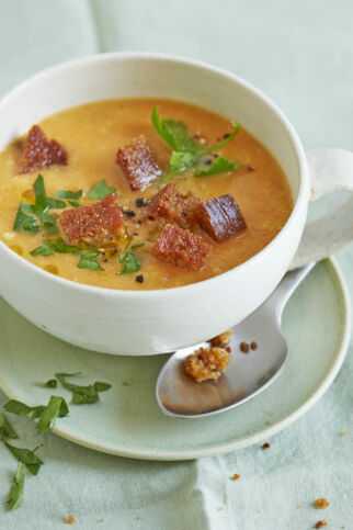 Kalte Mandel-Möhren-Suppe mit Harissa-Croûtons