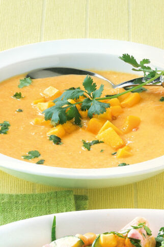 Curry-Möhrensuppe mit Hähnchen im Glas