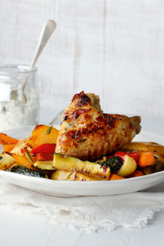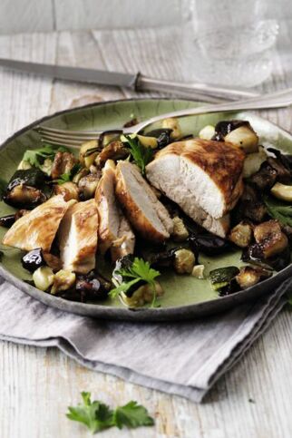 Hühnerbrustfilets mariniert und mit Ofengemüse