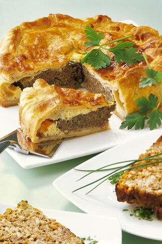 In den Teigdeckel in der Mitte solltest du ein Loch schneiden oder den ganzen Teigdeckel mit ein paar Schlitzen versehen, damit beim Garen der Dampf entweichen kann. Im Ofen wird das Gericht dann bei mittlerer Hitze gegart. Die Pastete aus dem Ofen nehmen und abkühlen lassen, dann aus der Form lösen und in Scheiben schneiden. Bei Pasteten, die kalt serviert werden, füllt man die beim Abkühlen entstehenden Hohlräume manchmal noch mit Gelee auf.