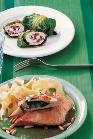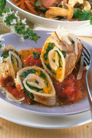 Für das Saltimbocca-Rezept belegen wir sie mit jeweils einer Scheibe Schinken und einem Salbeiblatt. Du kannst aber auch cremige Füllungen zubereiten, etwa wie bei den Paprika-Putenröllchen aus gekochtem Ei, saurer Sahne, Zwiebel, Paprika und Käse. Wenn Bärlauch Saison hat, schmeckt auch eine feine Creme-Füllung aus Frischkäse, Bärlauch und Toastbrot wie bei diesem Rezept. Achte bei streichbaren Füllungen darauf, dass du beim Bestreichen der Schnitzel rundherum einen 1 cm breiten Rand frei lässt und die Ränder leicht nach innen klappst, bevor du sie aufrollst.