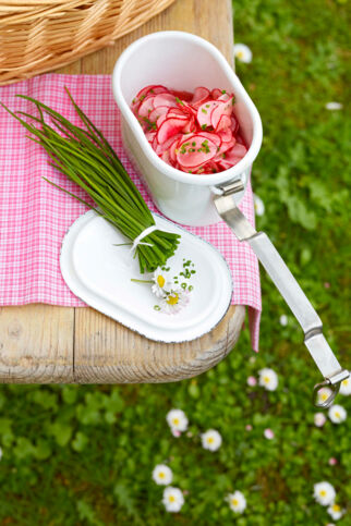 Besonders schön anzusehen und damit perfekt geeignet, um Gäste zu beeindrucken, ist zum Beispiel der Radieschensalat mit Kresse: Aus Vollkornbrot werden mit Dessertringen Kreise ausgestochen, darauf der knackige Salat verteilt und mit Rucola und Kresse angerichtet. Ebenfalls eine ungewöhnliche und leckere Idee: das schnelle Melonencarpaccio. Hier landen Radieschen und Zwiebeln zusammen mit Melonenscheiben auf einem Teller und ergeben einen fruchtig-frischen Augenschmaus.
