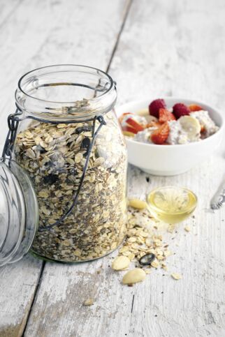 Erstmal ein herrlich crunchiges Müsli am Morgen? Fertige Müslimischungen enthalten fast immer zugesetzten Zucker. Selbermachen ist die Devise! Wer sich sein Müsli selber mit Nüssen, Haferflocken, Trockenfrüchten etc. zusammenmischt hat den Vorteil, genau über die Zusammensetzung und Zutatenauswahl entscheiden zu können. Ungeliebte Rosinen adé! Selbst Granola kannst du selber machen. Auch Overnight Oats, Porridge und Chia-Pudding sind optimal für ein gesundes Frühstück und sorgen für Abwechslung am Morgen. Noch etwas frisches Obst on top und der Tag kann beginnen.