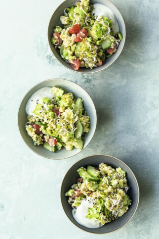 Wer die Schnippelarbeit nicht scheut, wird hier mit einem besonders raffinierten Salat belohnt. Hübsch angerichtet mit einem Servierring, ist er die ideale Vorspeise für ein sommerliches Menü. Übrigens: Der Salat schmeckt auch nach zwei, drei Tagen noch lecker.