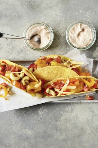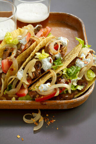 Tacos sind als schnelles Fast-Food aus der Tex-Mex-Küche bekannt. Diese kannst du auch ganz einfach und gesund zuhause in wenigen Minuten selbst machen. Die Taco-Schalen bestehen aus getrockneten Tortilla-Fladen und können nach Belieben mit klein geschnittenem Fleisch oder Gemüse gefüllt werden. Besonders beliebt sind Hackfleisch-Tacos mit Mais und Kidneybohnen, wie sie auch im Chili con Carne zu finden sind. Klick dich durch unsere leckeren Rezepte und lass dich von unseren Ideen inspirieren.