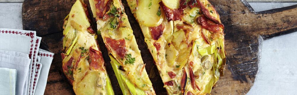 Und so geht's: Kartoffeln, am besten festkochende, in kleine Würfel schneiden und mit Olivenöl etwa 12 bis 15 Minuten anbraten. Dann die Zwiebeln glasig anschwitzen und ganz nach Gusto kannst du noch Zucchini oder anderes Gemüse dazugeben. Dann die Eier in eine Schüssel geben und mit einem Schneebesen kräftig schlagen, danach mit Salz abschmecken.