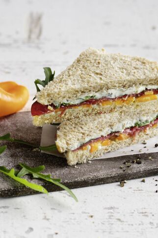 Mitnahme-Tipp: Je zwei Dreiecksbrote fest in Klarsichtfolie einpacken und 15 Min. pressen, indem du nicht zu schwere Vorratsdosen oder kleine gefüllte Konserven daraufstellst. So werden die Sandwiches kompakter, lassen sich besser transportieren und später essen.