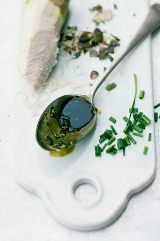Als Kräuter werden u. a. gerne Petersilie, Dill, Kerbel und Schnittlauch verwendet. Wenn du deine Vinaigrette mit Senf zubereitest, wirkt sich das stabilisierend auf die Emulsion aus, d. h. dass sich das Dressing nicht so schnell wieder in Essig- und Öl-Schicht trennt. Außerdem wird die Konsistenz der Sauce dadurch dickflüssiger.