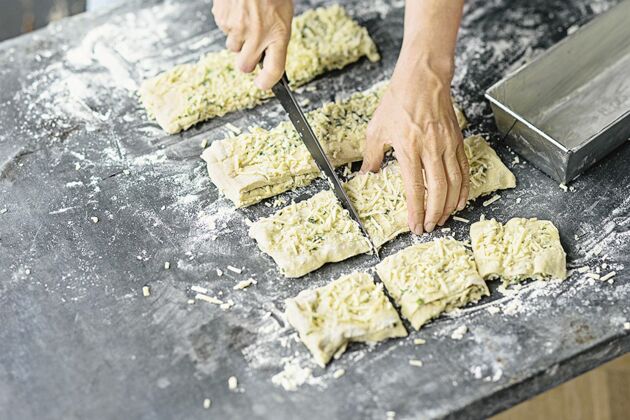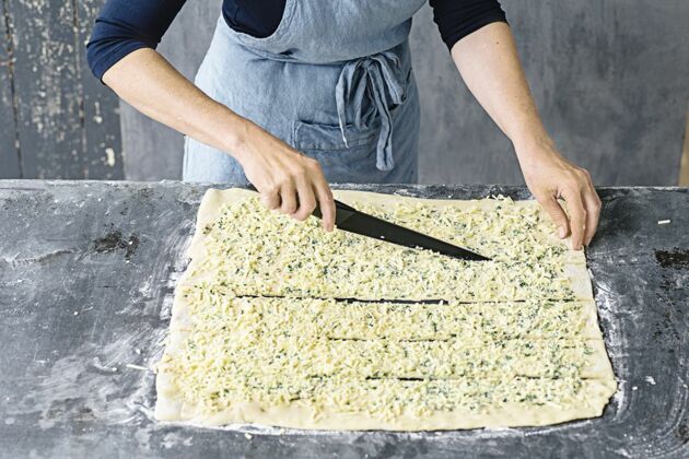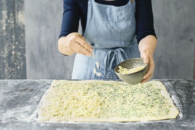 Die Zutaten für den Belag, beispielsweise geriebener Käse oder geschnippeltes Gemüse, sollten schon bereit stehen. So kann der Teig sofort belegt werden und bleibt nicht durch langes Liegen auf der Arbeitsfläche kleben. Nach dem Belegen den Teig dann zügig weiterverarbeiten.